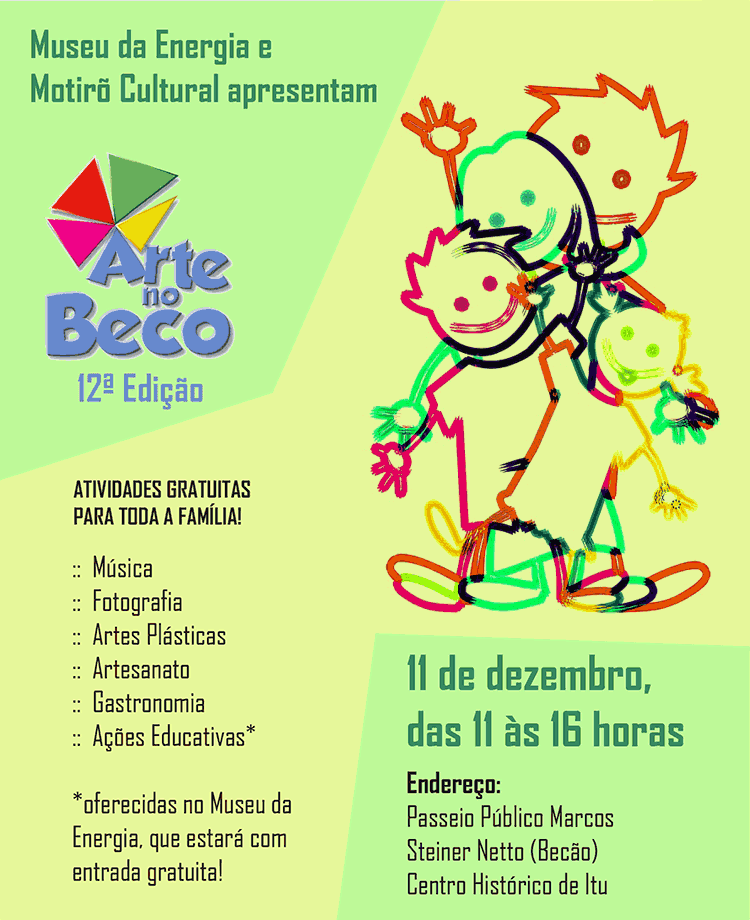 A 12ª edição do “Arte no Beco” marca as comemorações dos 17 anos do Museu da Energia de Itu que durante o evento estará aberto gratuitamente para visitação, e às 14h30, o Setor Educativo realizará a ação educativa “Colher de Pau”.
