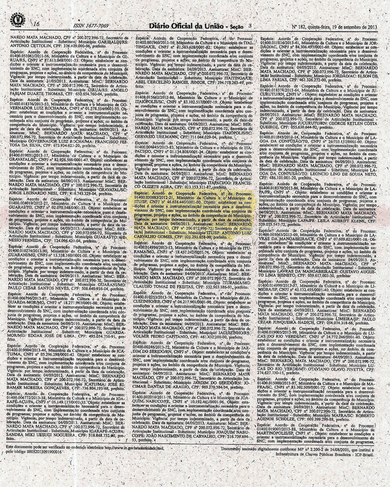 Diário Oficial da União no dia 19 de setembro de 2013