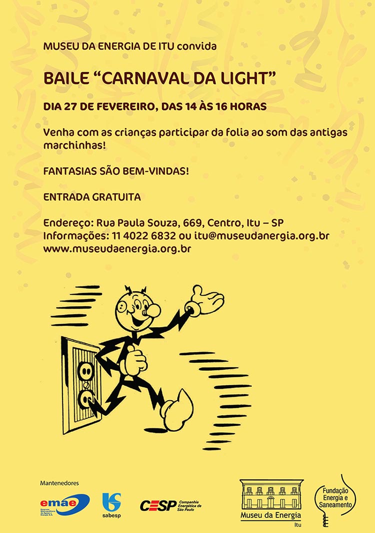 Na segunda-feira de Carnaval, 27 de fevereiro, o Museu da Energia de Itu promove uma tarde de folia para toda a família com o evento “Carnaval da Light”. O baile carnavalesco, que acontece das 14 às 16 horas, será ao som de marchinhas, em especial, dos anos 1940 e 1950, compostas e interpretadas por grandes nomes da época, como Carmen Miranda, Lamartine Babo, João de Barro (Braguinha) e o grupo Anjos do Inferno. A entrada é gratuita e o público é incentivado a ir fantasiado.