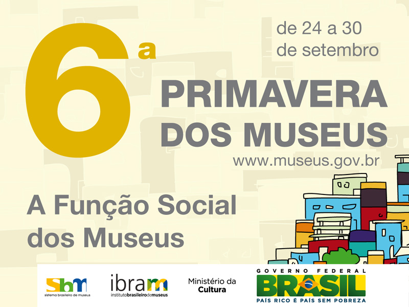 “A Função Social dos Museus” é o tema da 6ª Primavera dos Museus no ano de 2012, a ser realizada de 24 a 30 de setembro. Coordenado pelo Instituto Brasileiro de Museus (Ibram) e Ministério da Cultura (MinC), o evento tem por objetivo chamar a atenção de museus e sociedade para o debate em torno de assuntos da atualidade.