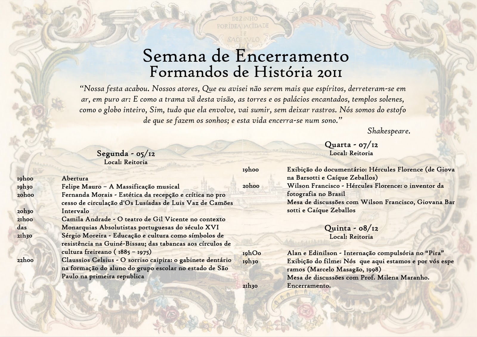 Para marcar o encerramento do ano e do curso de graduação em Historia da Turma de 2011, do Centro Universitário Nossa Senhora do Patrocínio – CEUNSP – será realizada uma semana de apresentações de trabalhos e mesas de discussões com o objetivo de fomentar a integração entre a sociedade e o curso de História.